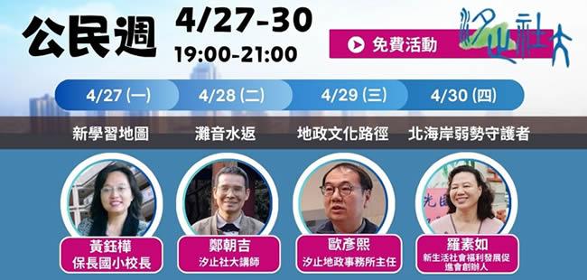 汐止社區大學從4月27日至30日舉辦公民論壇 歡迎大家來聆聽免費精彩演講
