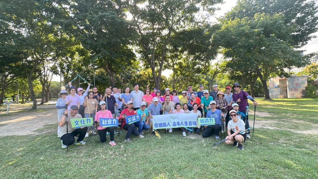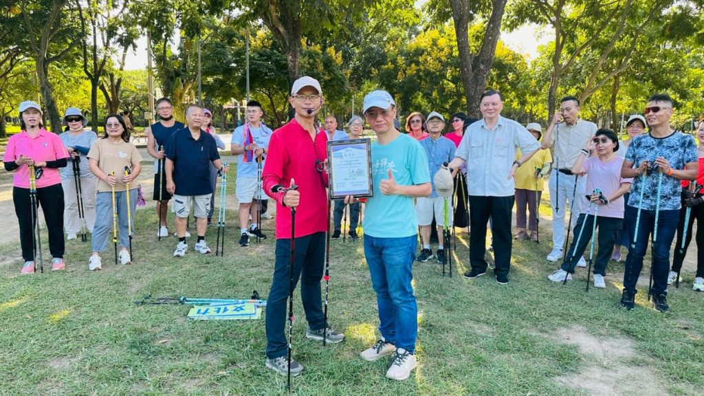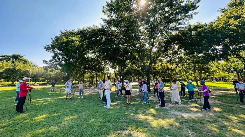 這時太陽已西斜,大家環坐草地聽士官長簡述故事。他因為保險工作過於忙碌被太太勒令退休,繼而從興趣中摸索出深耕北歐健走的領域。他的第一堂課在13位貴人的幫助下在汐止社大開班,至今早前進台北多所社大。到處都是一位難求的盛況。