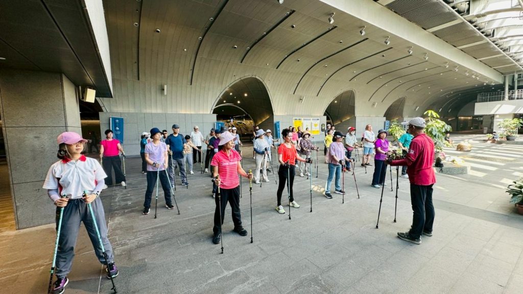 助教根據每位參加者的身高調整健走杖,再由士官長集合說明後移至戶外場地。很久沒有下午兩點在戶外活動,但士官長事先說明及過程中頻頻提點讓人很安心。課程中不時聽他喊著: